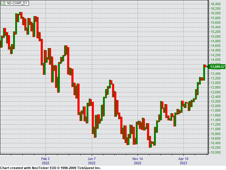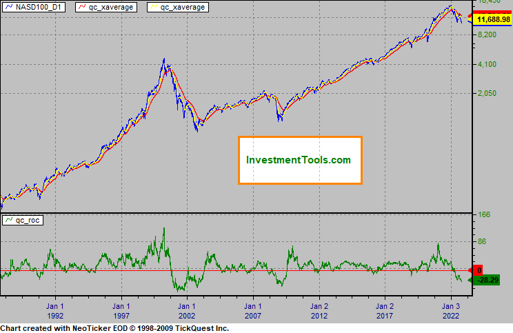 NASDAQ 100 (Arithmetic chart) and 200 day xaverage (red), 50 day xaverage (yellow), 200 day rate of change (green).