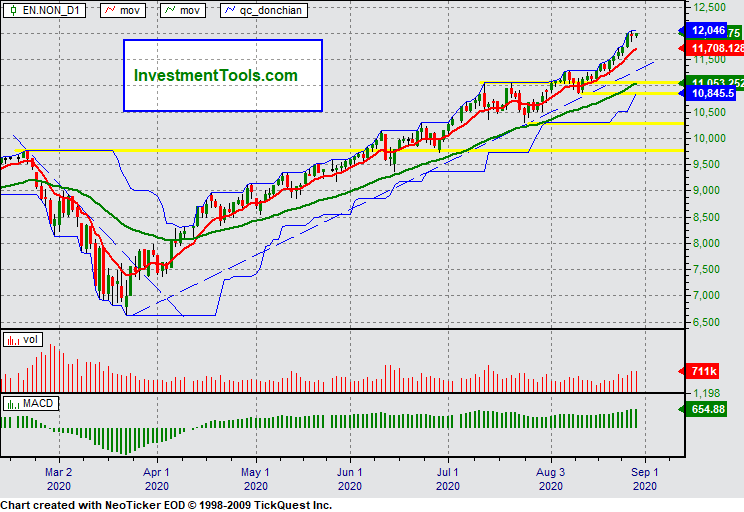 NASDAQ 100 Futures The Blue line is a Donchian channel, redline is a 5 day exponential average, green line is a 20 day exponential average. Vertical green bars MACD (Moving average convergence divergence) 5 and 20.