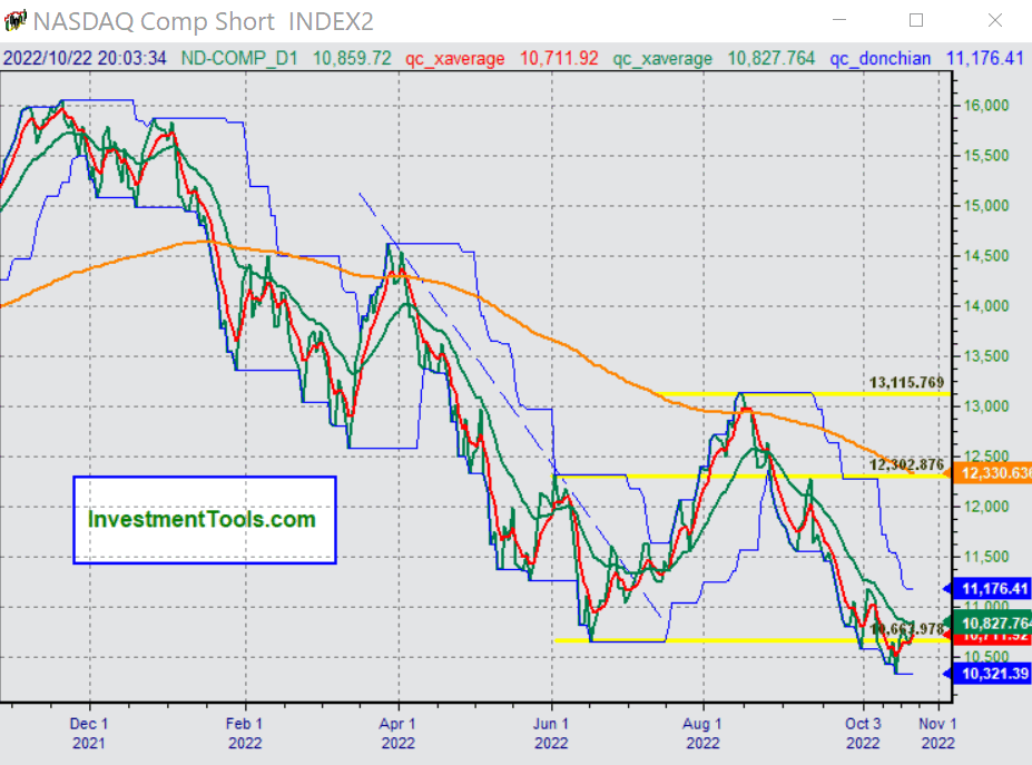 NASDAQ Composite (recent) The Blue line is a 20 day Donchian channel, redline is a 5 day exponential average, green line is a 20 day exponential average,200 day xaverage yellow.