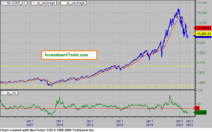 NASDAQ Composite Logarithmic chartand 200 day exponential average (red),50 day xaverage (yellow), 200 day rate of change (green).